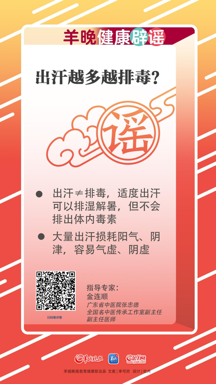 出汗越多越排毒?有人认为夏季大量出汗可排出体内湿气、寒气,这是正确的吗?广东省中医院张忠德全国名中医传承工作室副主任金连顺提醒,这都是错误的认知。